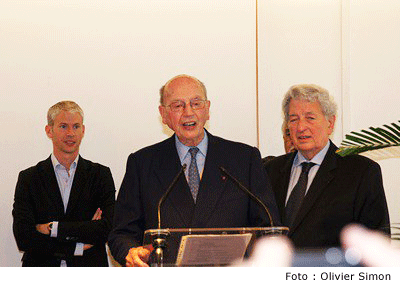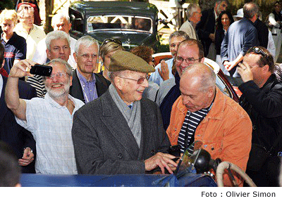 Sessel die Ovationen entgegennahm. Der Bürgermeister und andere hielten die Reden, die man an einem solchen Tag erwarten konnte, die Verdienste von Firma und Mensch wurden gewürdigt, Medaillen und Urkunden überreicht, Blumenbuketts an Frau Panhard und das Geburtstagskind übergeben — alles formvollendet. Und doch gab es diese kleinen Szenen zwischendurch, zum Beispiel als Josianne, der so herzliche und freundliche „gute Geist” des Events, dem Jubilar das eigens zum Anlass erstellte Buch mit den 100 Panhards von Crécy und den Geburtstagsglückwünschen Ihrer Besitzer an Jean Panhard übergab. Jeder im Saal spürte durch ihre Gestik und Mimik, dass hier eine ergebene und bewundernde Freundin des Mannes und des Panhard-Hauses ihn am liebsten geherzt, umarmt und geküsst hätte. Ebenso erging es wohl Jean Panhard selbst, der — gestützt von seinen Enkeln — dann tatsächlich selbst zum Rednerpult schritt und ein perfektes Bild von Contenance, Freude und Korrektheit bot