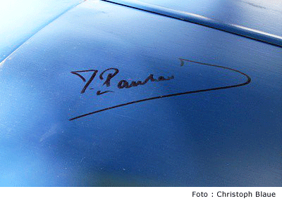 Von Raimund angesprochen nahm sich Jean Panhard die Zeit, unterhielt sich ausgiebig mit Raimund über den blauen Gefährten und als ihm dann ein Filzstift ausgehändigt wurde, da geschah das Unglaubliche: