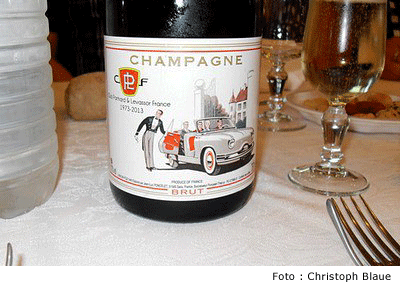 Die Flaschen kamen gleich so auf den Tisch und lösten ein großes Ahh! und Ohh! aus. Denn der gute Tropfen war extra für die Panhardisten abgefüllt worden, und die Flaschen trugen ein Etikett mit Panhard-Logo und Panhard-Motiven. Da konnten die Deutschen nicht anders und tranken sehr schnell, um die leeren Flaschen dann still und unauffällig in den Taschen verschwinden zu lassen. Und so steht in mindestens vier deutschen Haushalten heute eine leere Champagnerflasche im Regal und zeugt vom panhardischen Geist.