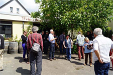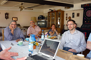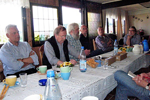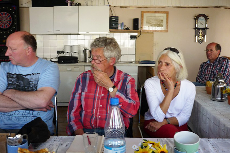 Um 14 Uhr fanden wir uns zur Versammlung ein. Wolf und Uschi hatten einen Raum in der ausgebauten ehemaligen Scheune bei seinem Nachbarn für die Versammlung bekommen, der sehr gut geeignet war. Trotz der Hitze draußen war es drinnen vergleichsweise kühl. Begrüßt wurden wir von der Ortsvorsteherin Helga.