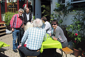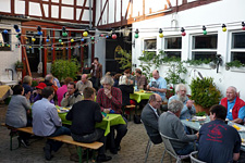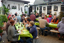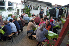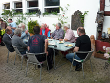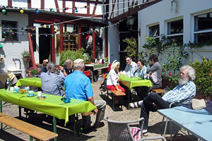 Nach der Versammlung luden Wolf und Uschi zum Grillen bei sich. Die Beiden haben eine wunderschöne Hofreite mitten im Dorf mit einem liebevoll gestalteten Innenhof. Uschi hatte mit Unterstützung von Gisela Herbst tolle Salate gemacht, dazu gab es leckeres Brot, Dips und eine Knoblauchbutter, die diesen Namen auch wirklich verdiente.