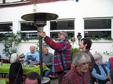 Wolf stand mit langer Gabel am Grill, und jeder konnte sich von den perfekt gegrillten Fleischstücken und Würsten soviel nehmen, wie er oder sie wollte. Später übernahm Peter Breed die Grillaufsicht. Es gab frisches Pils vom Fass, Wein und nichtalkoholische Getränke.