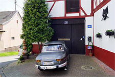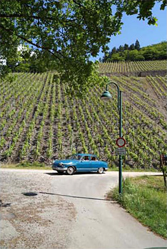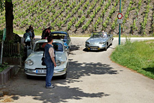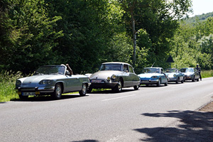 Gegen 10:00 Uhr trafen wir uns auf einem Parkplatz in Franken, vielleicht 100 Meter von Wolfs Anwesen entfernt, ein — unter einem Frühsommerhimmel, der einen herrlichen Tag versprach. Wir versuchten, mit einer Reihe zweizylindriger PL 17 und PL 24 dem gerecht zu werden. Und in der Tat: Harmonisch fuhren die Panhards im Konvoi (eine Citroën DS hatte sich auch angeschloosen) durch schöne Landschaft — Autos, die sich in Größe und Linienführung in die weiche Natur einzufügen vermögen.