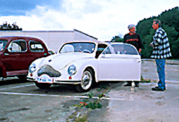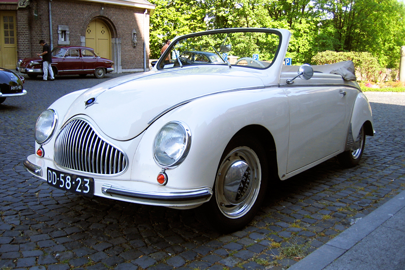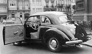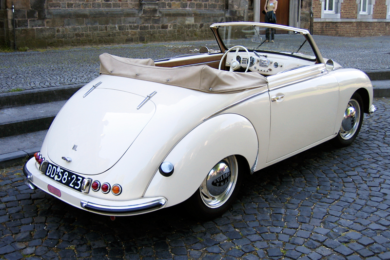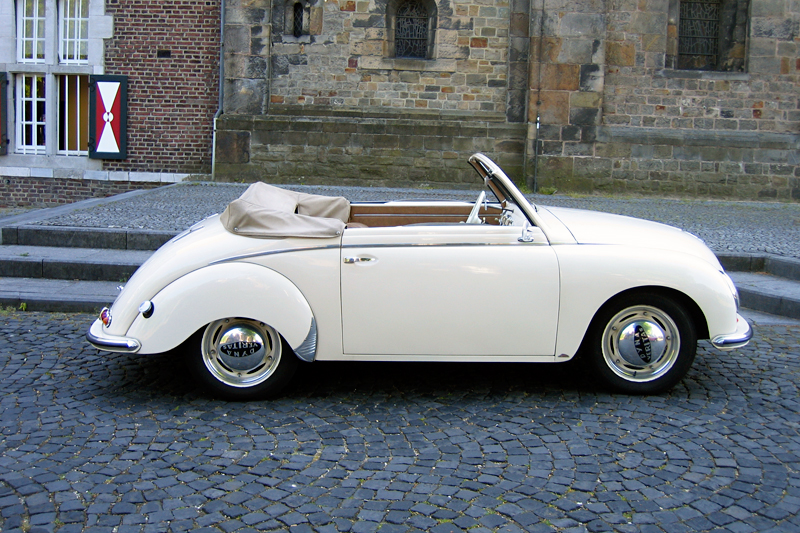 Käfer dieser Baujahre verwendet wurden. Der Rest, also u.a. der Frontbereich, sind ein Eigenentwurf, der stark an die 2 Liter Veritas erinnert, insbesondere der gewölbte Kühlergrill. Insgesamt wirkt die gesamte Linie etwas schwerfällig (Vermeylen meinte dazu: „typisch deutsch”), aber den Rundungen ist ein gewisser Charme nicht abzusprechen (was ich nur unterstreichen kann). Und darüber hinaus: welcher Fan ist nicht verwundert, unter der Haube einen Panhard-Boxer zu finden?